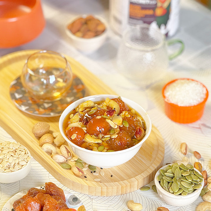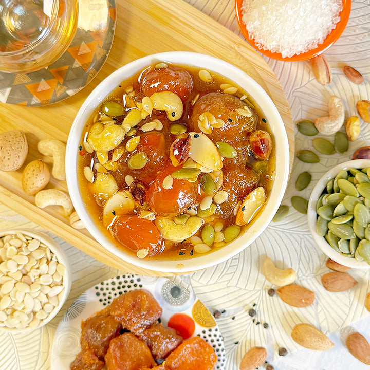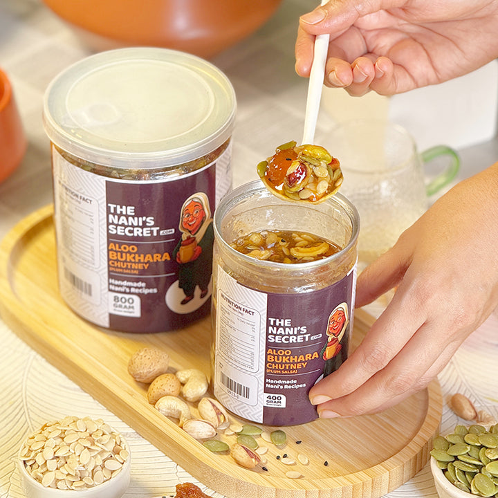 This rich chutney combines dried plums, raisins, almonds, pumpkin seeds, and more into a sweet-tangy medley. A luxurious spread or side dish that complements BBQs, rice dishes, or even as a stand-alone snack.