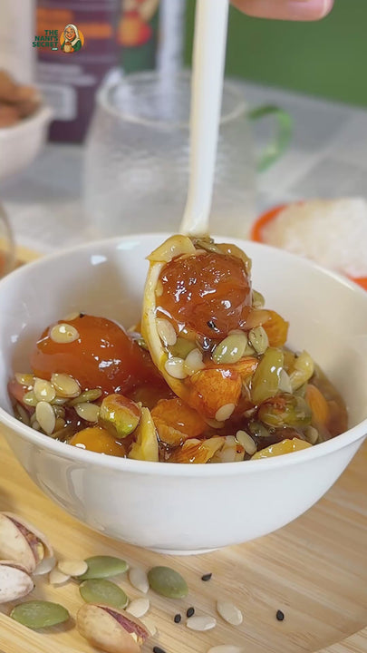 Ingredients: Dried plums (aloo bukhara), almonds, raisins (kishmish), malta, black cumin, sugar, pumpkin seeds.