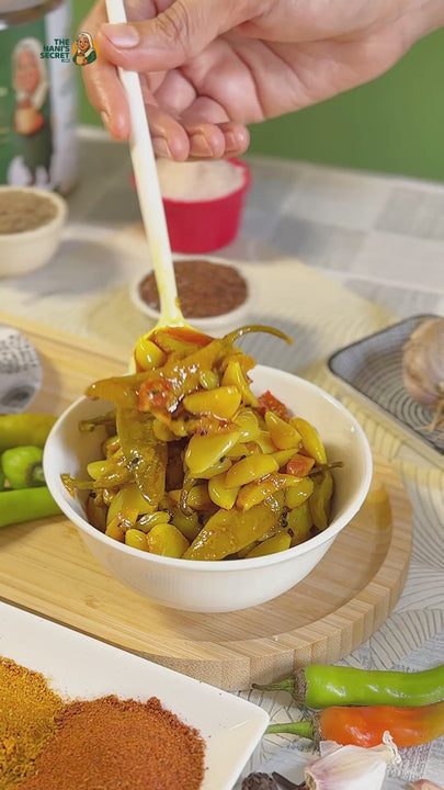 A fiery combination of green chilies and garlic, this achar is for spice lovers. With every bite, you get the heat of chillies and depth of garlic, wrapped in aromatic masala.