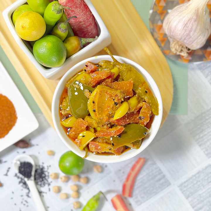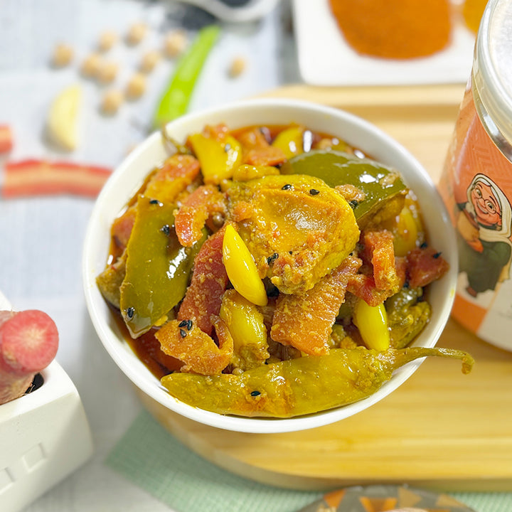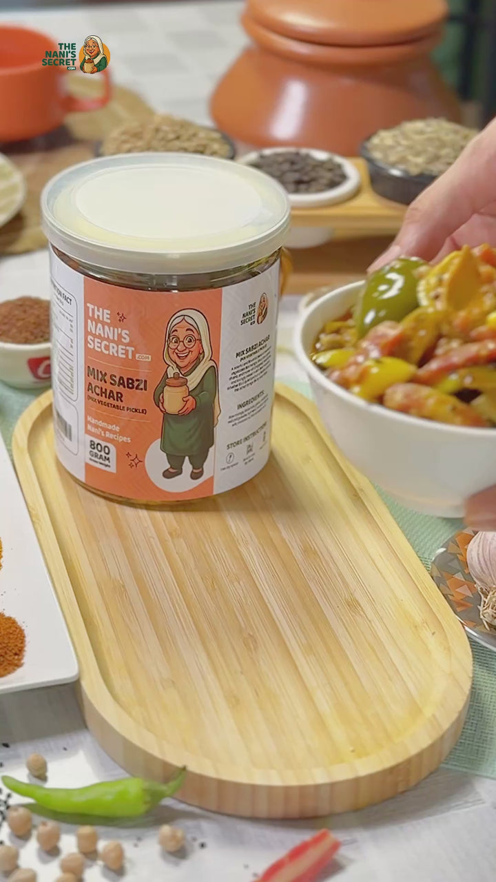 A colorful and flavorful blend of seasonal vegetables like mango, lotus root, garlic, chana, and more—all chopped, marinated, and lovingly mixed in rich desi masalas. Whether it's a quiet lunch or a festive daawat, this achar brings life to your table.